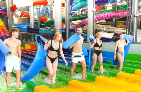 Group of friends at Suntago, after a thrilling race down the colorful water slide
