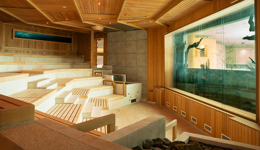 Before entering the sauna, take off your swimsuit and wrap yourself in a towel. You can leave your swimsuit on the shelves in changing rooms or in the showers