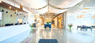 Three women relaxing in the Relax zone pool, tropical forest in the background